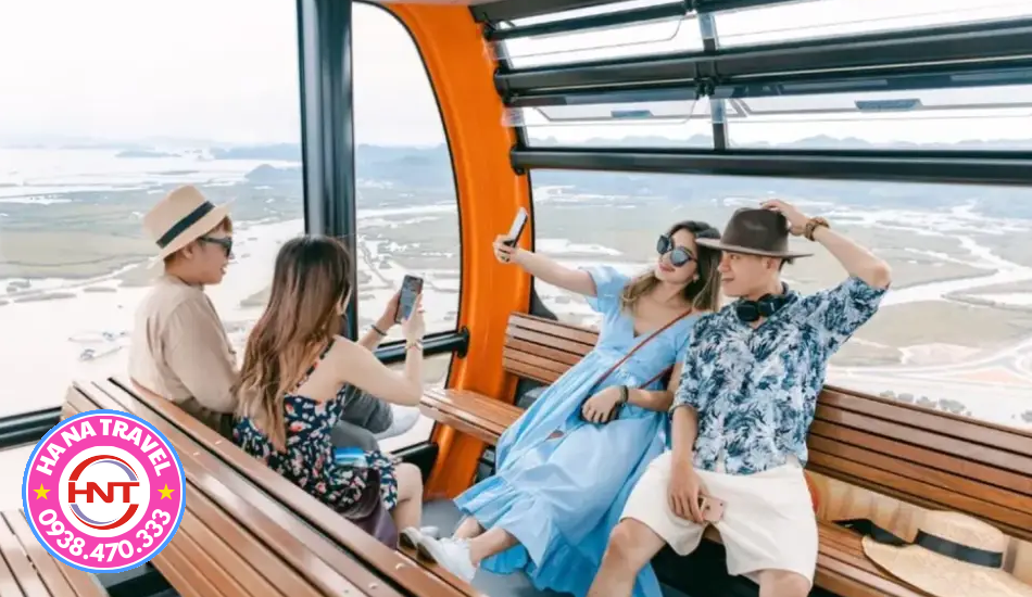 +09h00: Xe tới ga Cáp Treo Sunworld, quý khách mang theo hành lý lên cabin sang đảo Cát Bà, trên cabin độ cao 80 – 100m quý khách ngắm cầu cảng Hải Phòng, dẫy núi đảo đá, Xe chung chuyển và hướng dẫn viên đưa đoàn về trung tâm thị trấn Cát Bà, đoàn chúng ta sẽ đi con đường ven biển độc đạo bầu trời bao la đẹp nhất Cát Bà.
